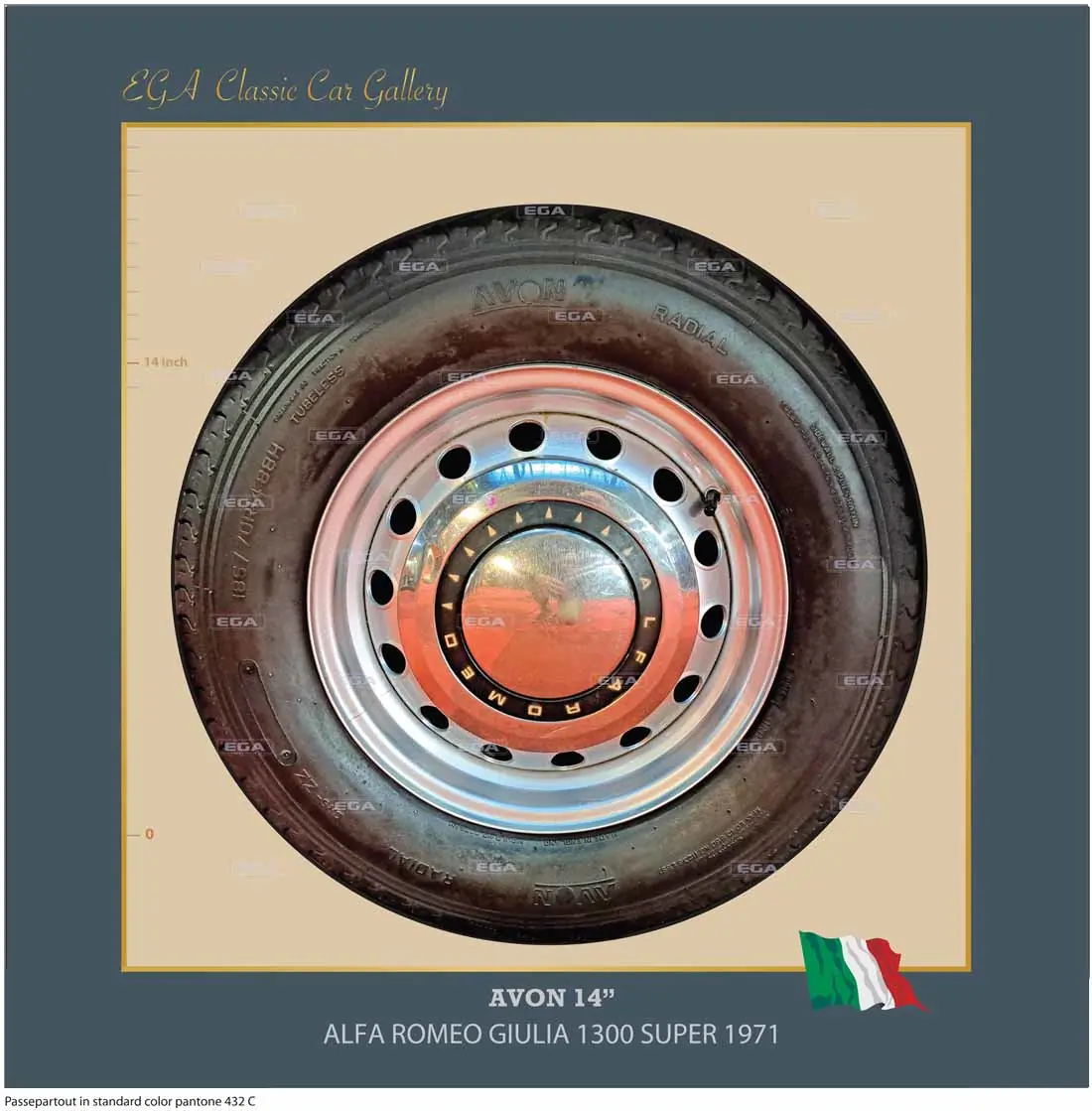 Each wheel poster can be printed in any passe-partout color and framed in a photoframe or tray. You can also choose to make a selection of wheels, have them placed in a collage design, and have the collage printed and framed. This can even be done with your own company name instead of the text “EGA CLASSIC CARS GALLERY.” It will be a real eye-catcher and a conversation starter in your showroom.